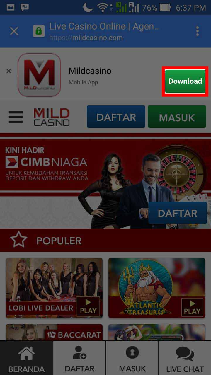 1. Masuk ke menu Browser Mobile anda dan Kunjungi www.MildCasino.com setelah itu klik menu MOBILE lalu klik button Download Now, dan tunggu proses download selesai.