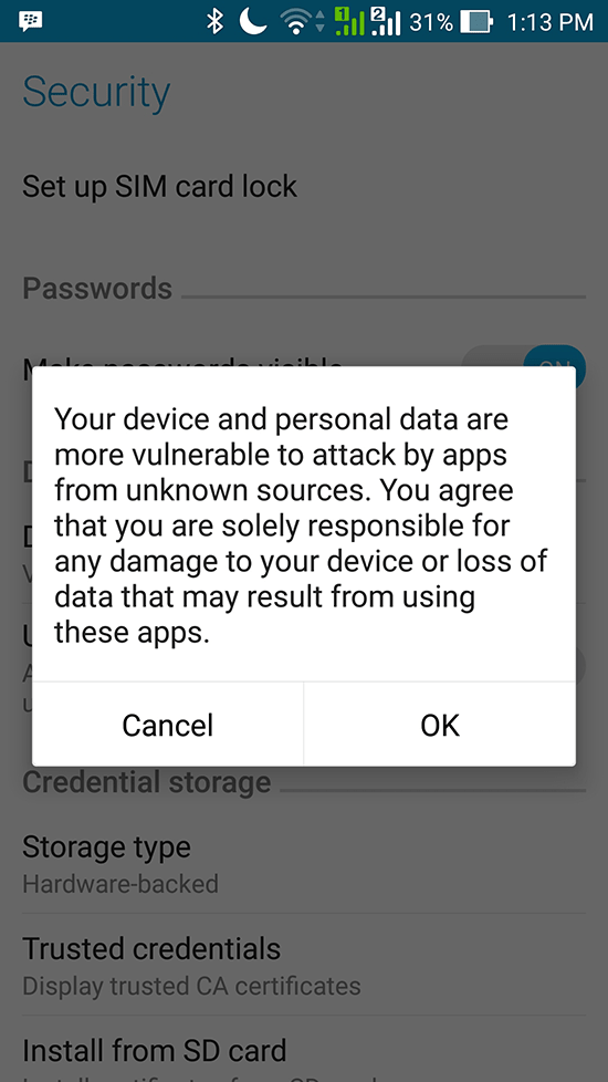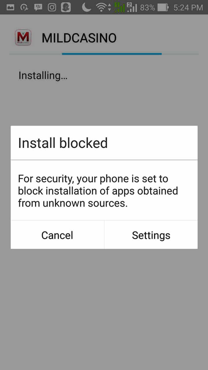 2. Jika sudah selesai, klik dan install langsung file MildCasino.apk, jika muncul keterangan Install Blocked, Pilih dan Klik “Settings”, setelah itu pilih “ Unknown Source” di bagian “ Security”, Centang/Klik pada bagian seperti yang dilingkari pada gambar dibawah ini.
